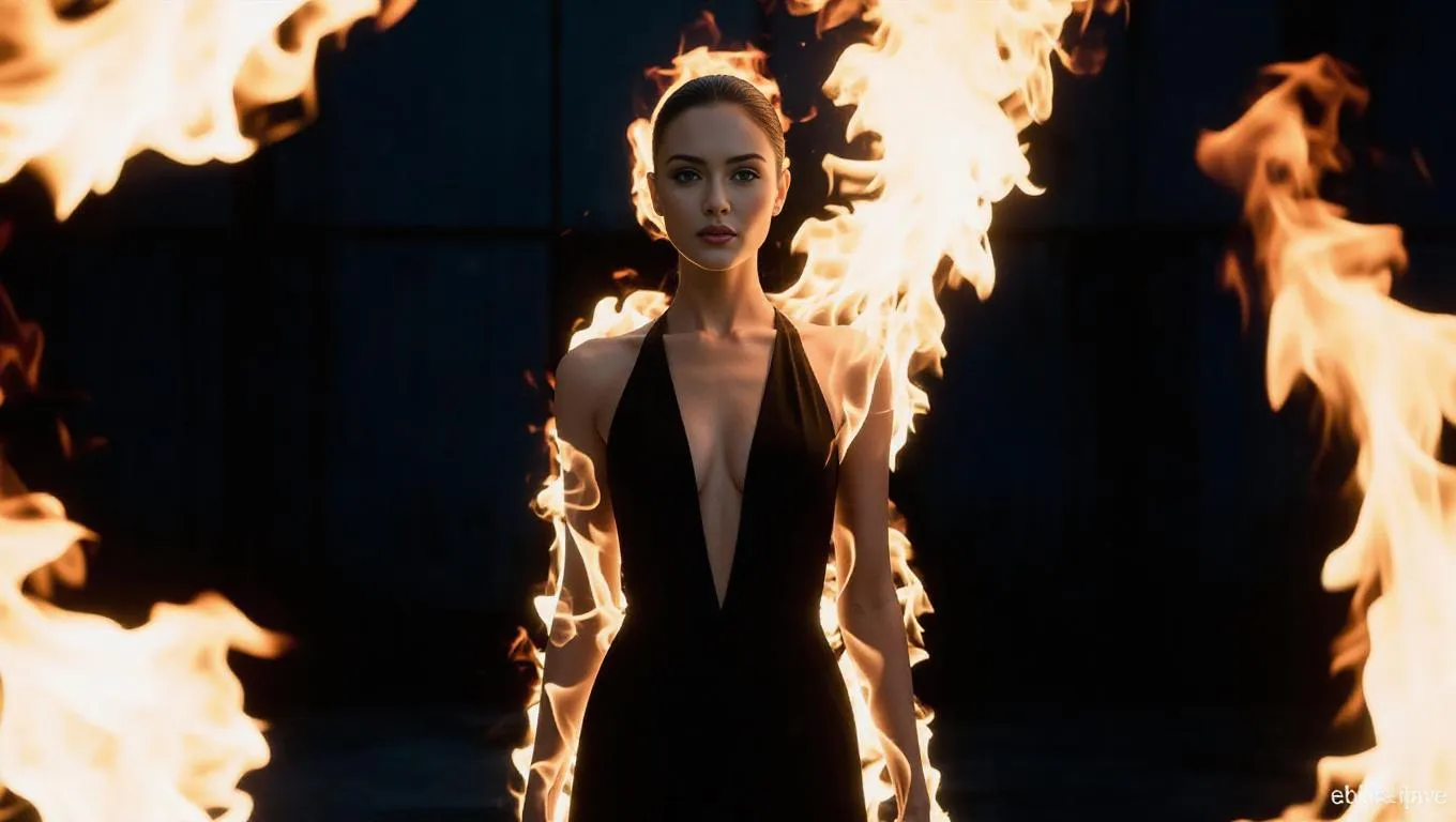 A stunningly beautiful woman wearing a minimalist jumpsuit, the entire outfit engulfed in roaring flames that illuminate her figure against a dark, shadowy background. The fire dances around her, casting flickering light and dramatic shadows, creating a surreal and intense atmosphere. Her expression is calm yet powerful, exuding an air of mystery and strength. The intricate details of the burning fabric are highlighted with high-resolution, ultra-realistic textures, while the contrast between the fiery jumpsuit and the darkness emphasizes the scene's dramatic tension. The overall composition is both haunting and mesmerizing, blending elegance with raw, elemental energy.