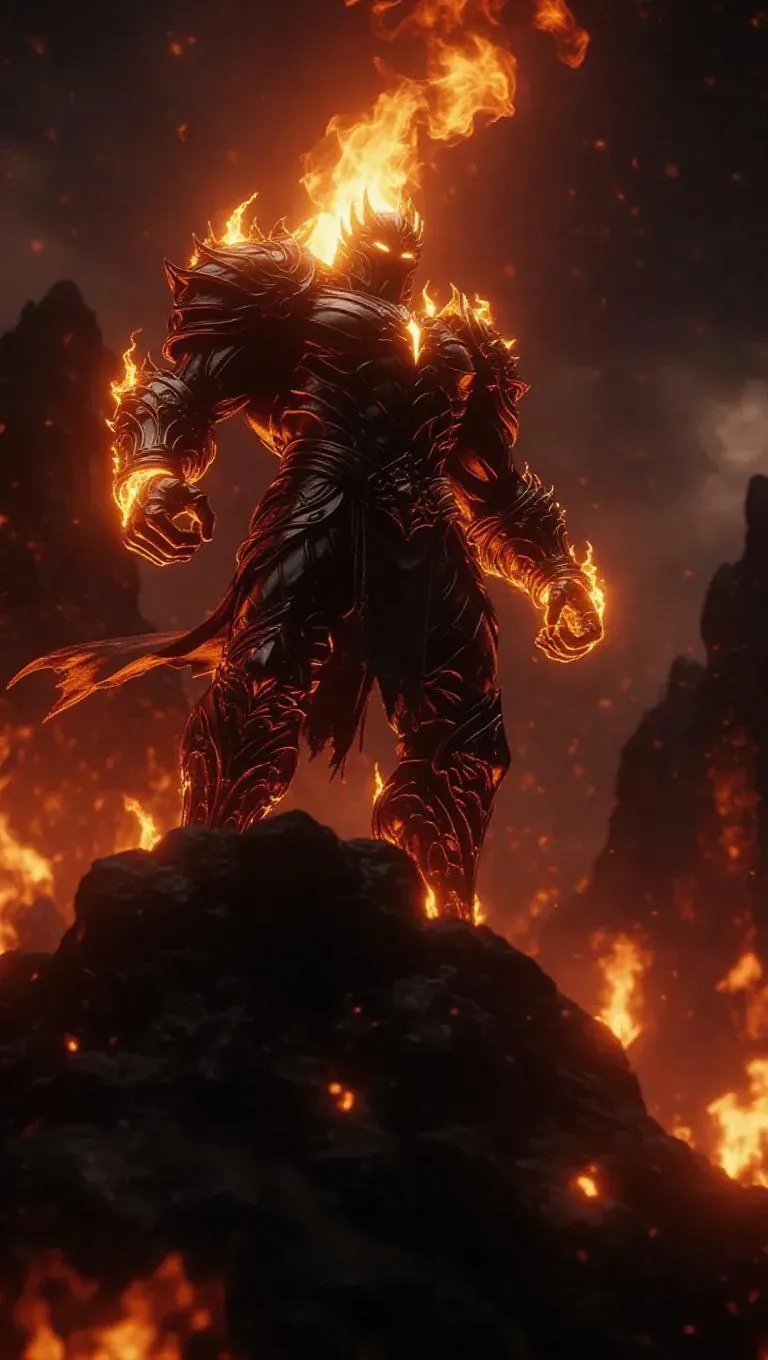 A fierce fire titan, his essence formed from dancing fire, towering on a peak of ashen remains, flames soaring upwards, ultra-detailed, dark fantasy