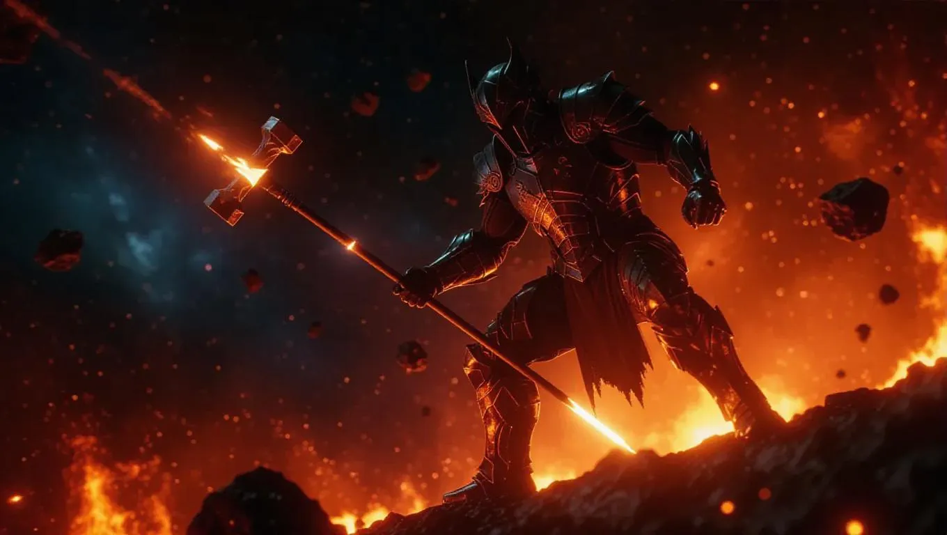 A metallurgist in a stormy landscape, forming spears from metal shards in volcanic flames, each impact summoning flickers of light. Heroic narrative, hammer hits generating star clusters in the background, amidst a swirl of asteroid belts and luminous skies.