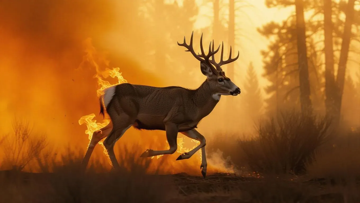 a distressed mule deer fleeing a California wildfire, its hindquarters engulfed in licking amber flames. Use a Phantom Flex 4K at 500fps to capture individual hairs igniting and curling upward. Dynamic inferno lighting casts shifting shadows across its contorted face, with fire reflections shimmering in dilated pupils. Billowing smoke filters golden-hour sunlight into a blood-orange haze