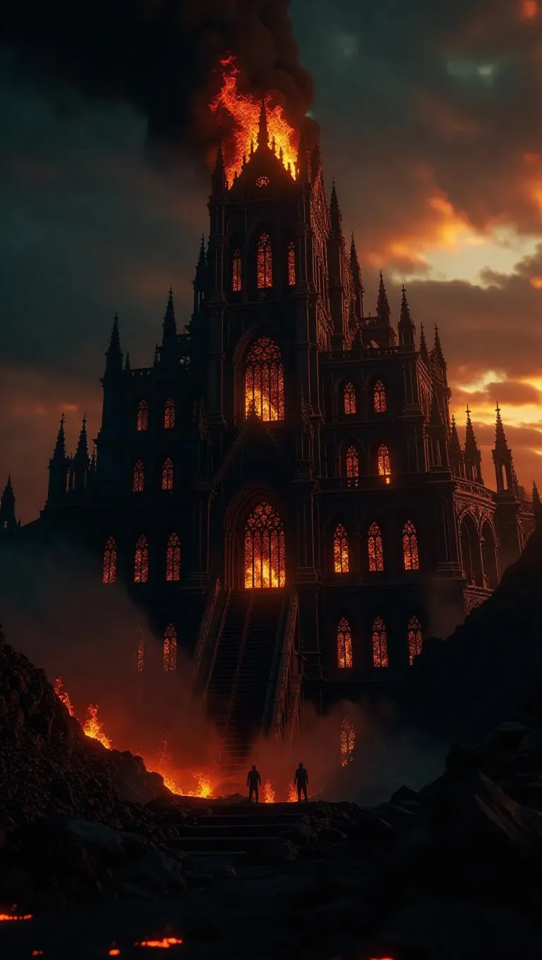 AI archaeologists uncovering Atlantis through volcanic ash projections, each eruption revealing the city's demise in molten flames. Lidar imagery blending with Gothic stained glass flames.