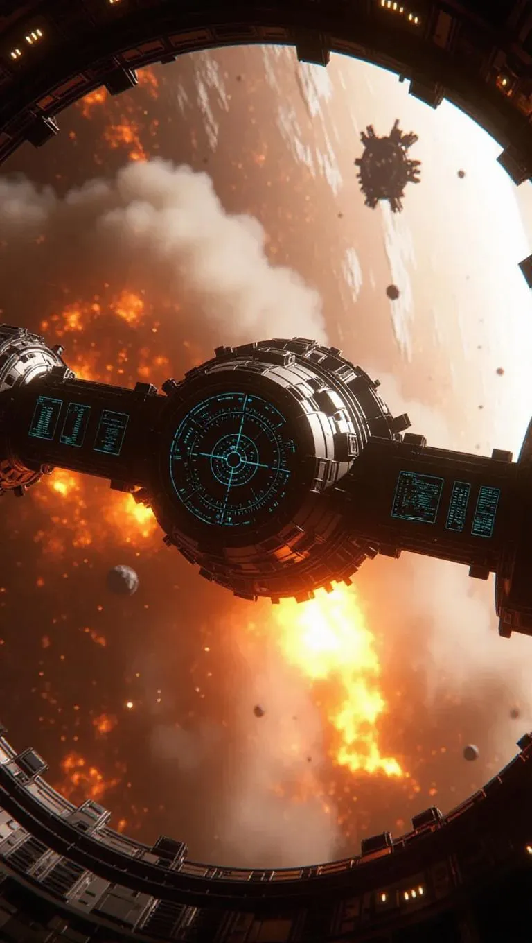 In the vastness of space, an advanced space station is ablaze. The outer hull is riddled with explosive damage, with flames and sparks shooting out into the darkness. Inside, the long corridors are filled with thick smoke and fire, with astronauts in silver emergency suits trying to control the disaster. The control room is a flurry of chaos, with screens displaying failures and alarms blaring loudly. The windows show the gloomy expanse of space, with a distant starfield visible, a stark contrast to the fiery chaos within. The station’s thrusters fire erratically, trying to stabilize the structure, but the flames continue to spread, threatening to consume everything.