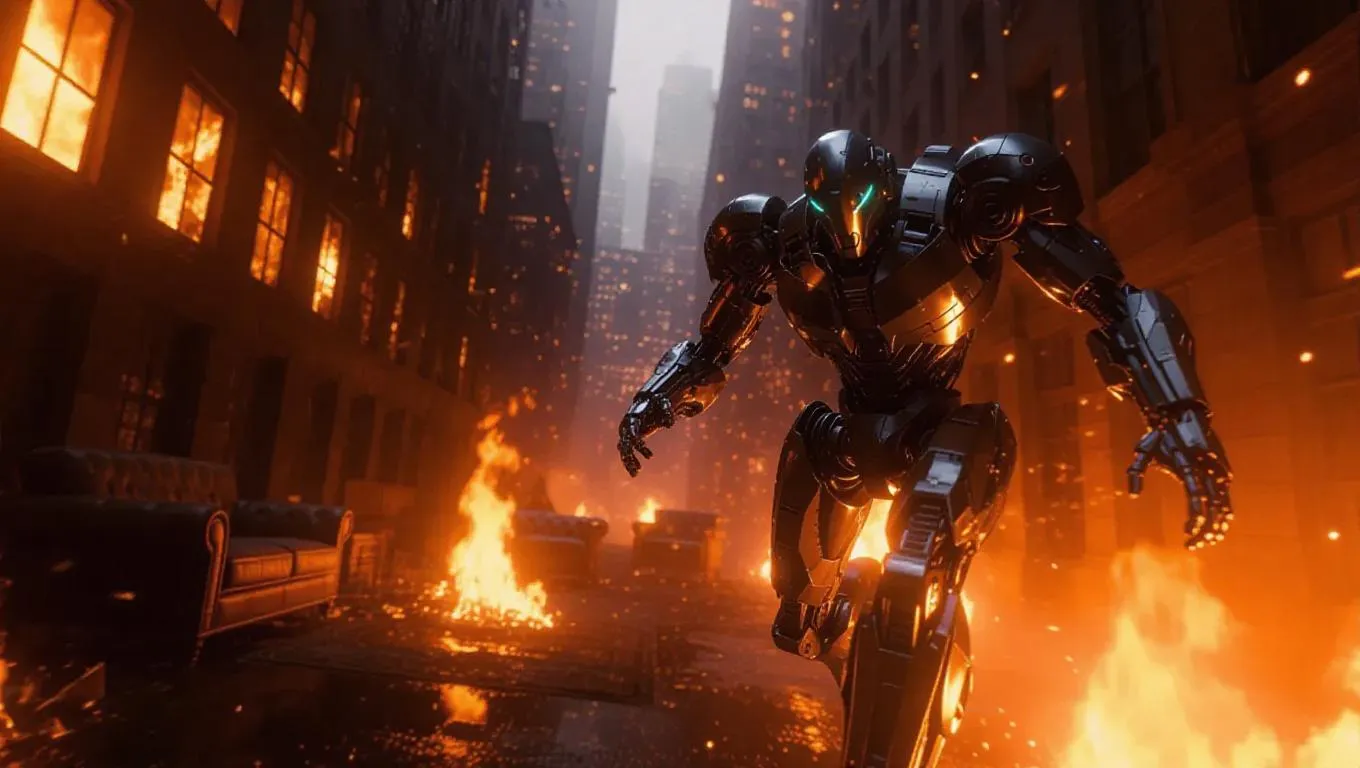 Robotic rescue teams with molten metal skin battling sentient flames in a high-rise building, sparks flying over burning furniture. Dynamic mecha combat scene, chrome reflections distorted by heatwaves, with a robot engulfed in flames.