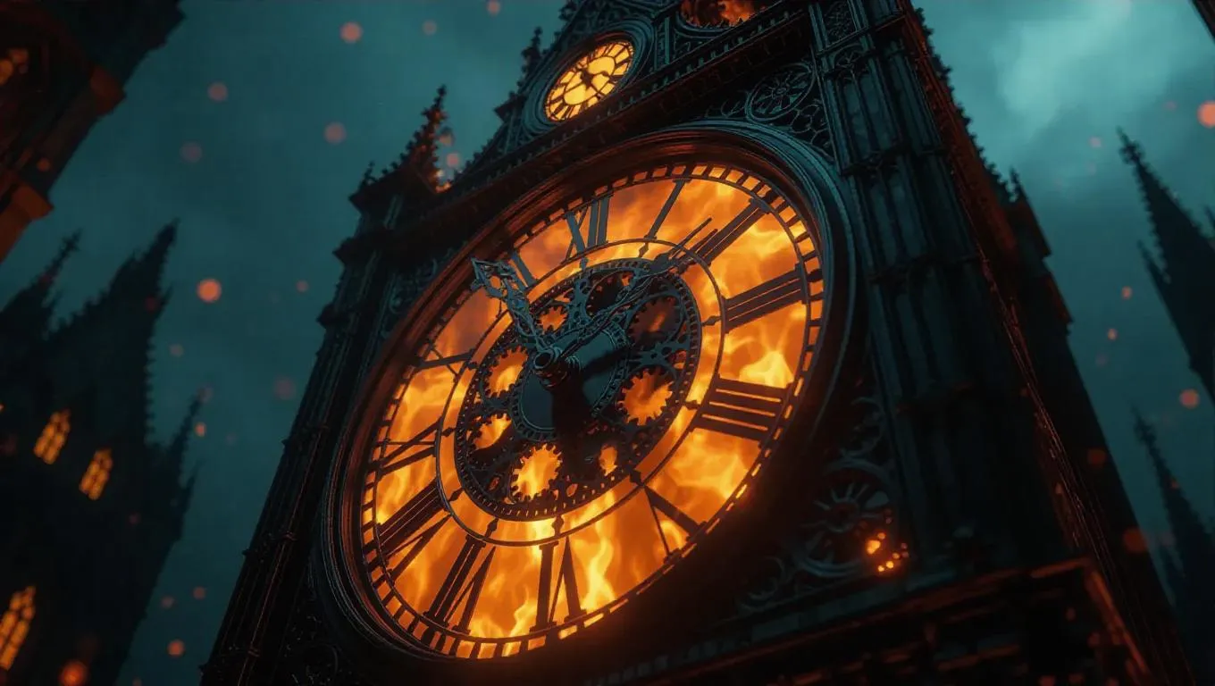 A colossal ancient clock tower illuminated by roaring fire, gears and cogs melting, cyberpunk aesthetics, dramatic lighting, ultra-detailed.