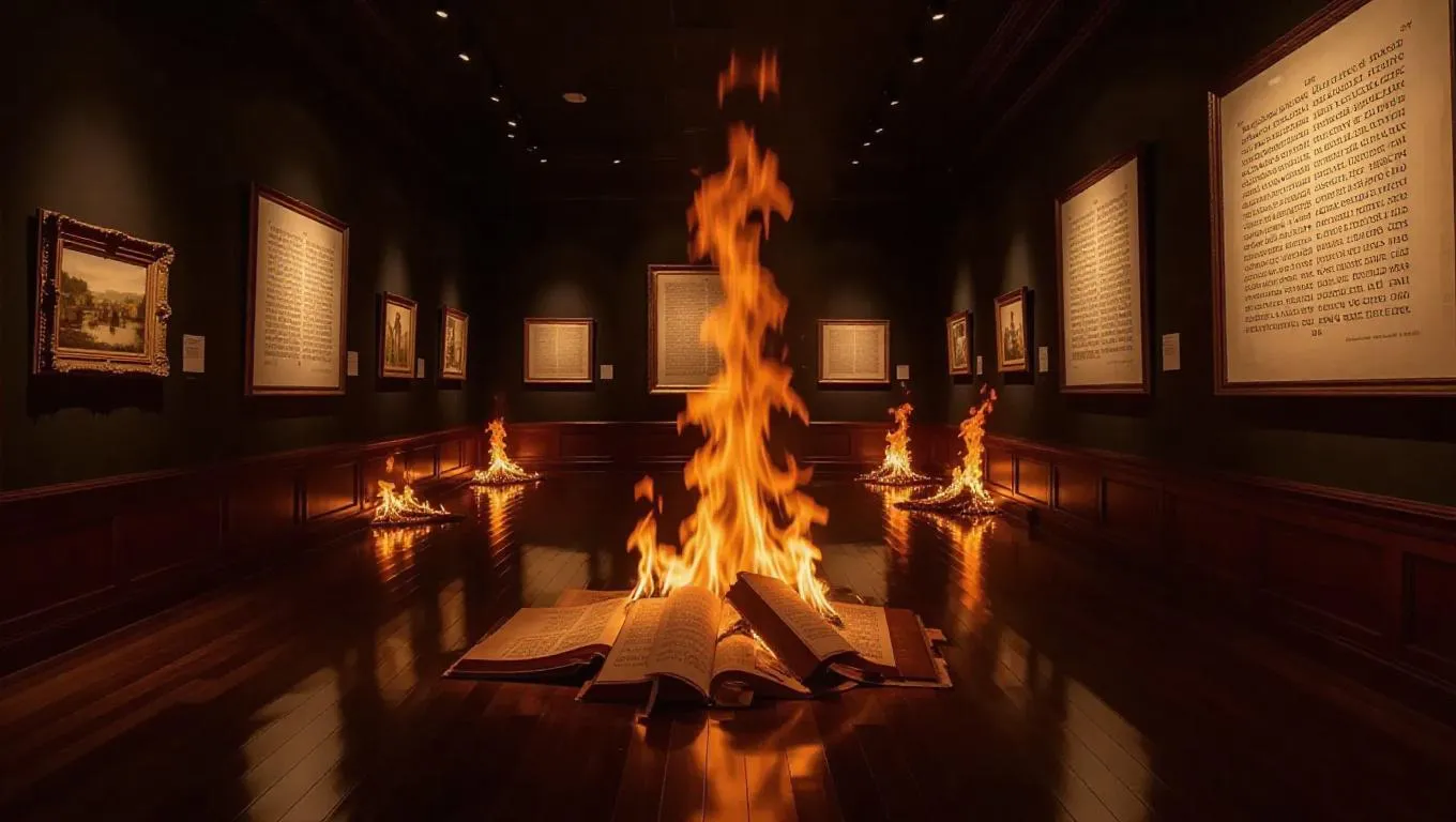 An art gallery, once a sanctuary for priceless masterpieces, is now a raging inferno. The walls, once adorned with illuminated manuscripts, are now a charred, blackened husk. Flames leap from one manuscript to another, consuming the parchment and ink with voracious intensity. The oak floors are cracked and glowing red-hot, as if the very foundation of the gallery is being devoured by the fire. The air is thick with the acrid smell of burning paper and ink, making it nearly impossible to breathe.