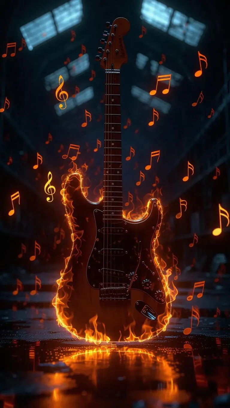 A burning electric guitar playing itself in a haunted music warehouse, musical notes forming fiery crescendos, magical realism, dramatic composition, ultra-detailed.