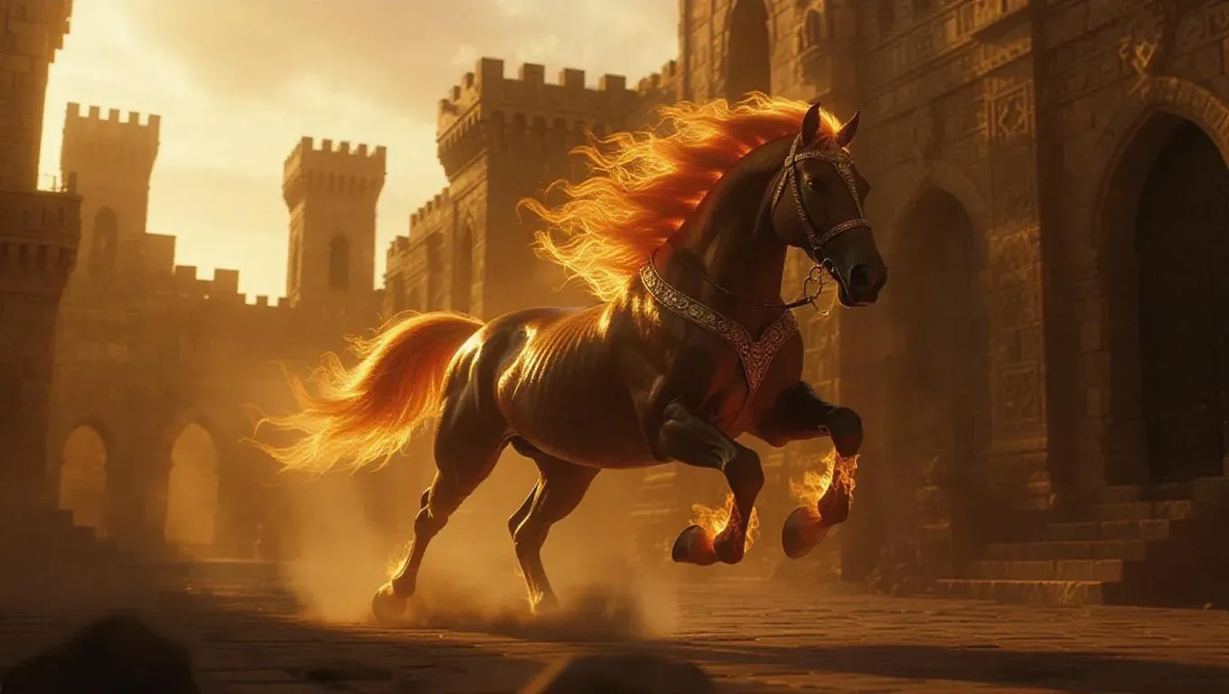 A fierce fire horse trotting through an ancient stone city, its mane and tail blazing with supernatural flames, dramatic fantasy illustration, highly detailed