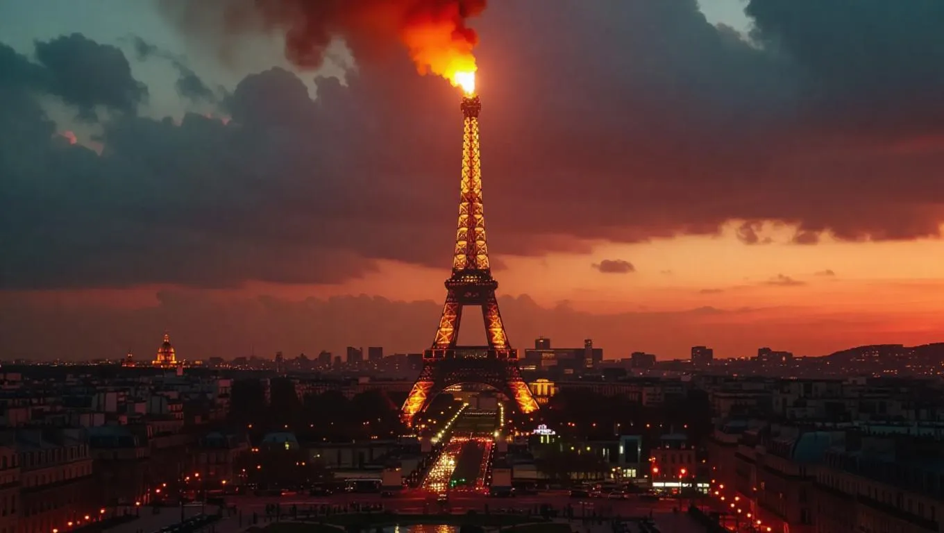 Eiffel Tower transformed into kilometer-tall gas burner, Art Deco ironwork glowing like neon light highways. Parisian rooftops flooded with liquid fire reflecting surrealist cloud formations.