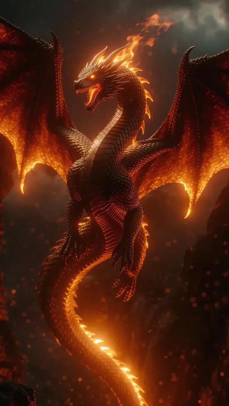 A colossal fire serpent with wings unfurled in grandeur, echoing a powerful roar, the sky illuminating with its heat, ultra-detailed, cinematic epic fantasy