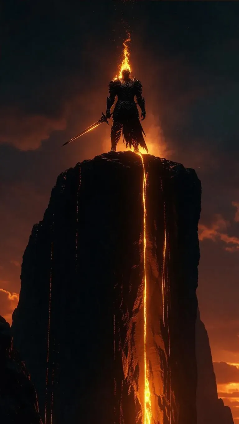 A celestial fire warrior, his silhouette defined by flickering flames, positioned atop a cliff of melted armor, fire cascading down, ultra-detailed, dark fantasy