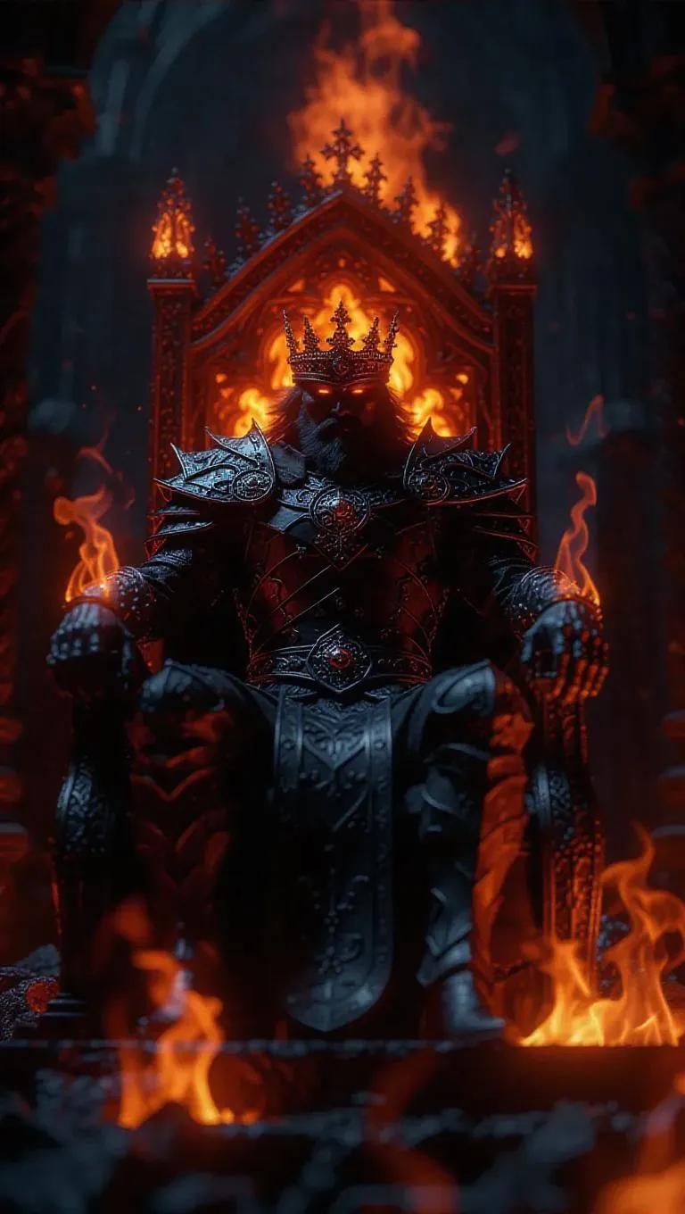 A majestic fire king, his entirety glowing with molten lava, seated on a throne of charred crowns, flames spiraling into the night, ultra-detailed, dark fantasy