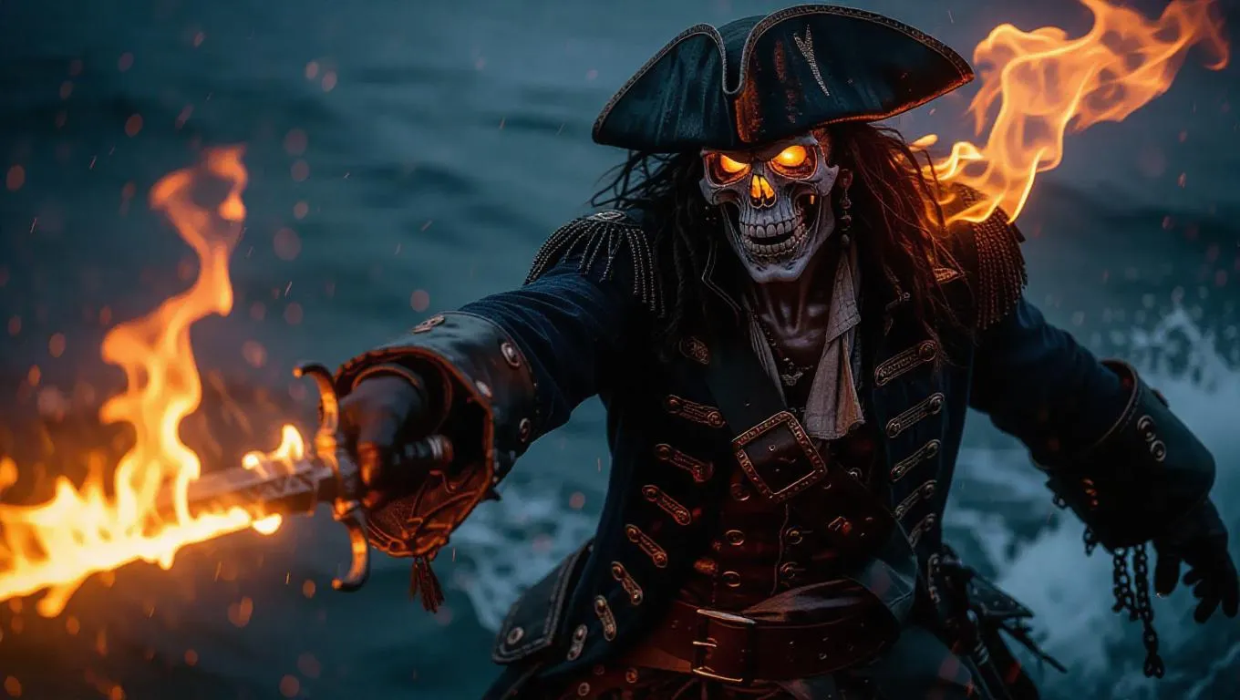 A tragic figure of a pirate with a flaming skull, his weathered coat shimmering with embers, wielding a blazing cutlass, spectral flames engulfing the stormy brine, visually engaging