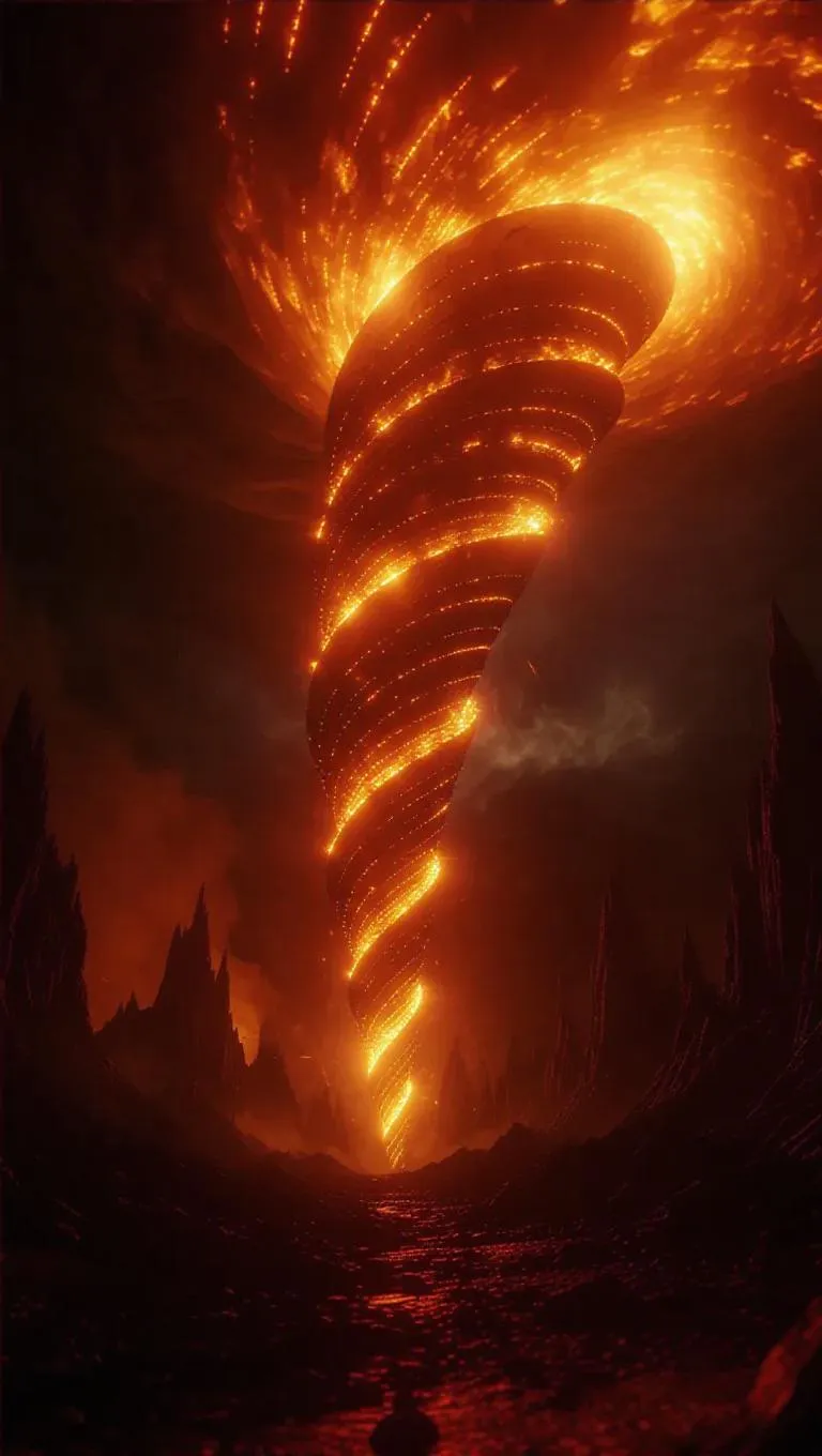 A colossal fire tornado tearing through an alien landscape, swirling embers, dramatic lighting, cinematic destruction, hyper-realistic flames