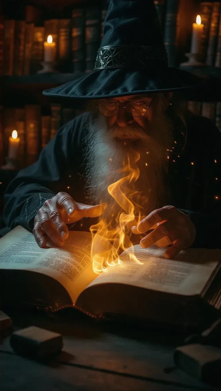 A wizard opening an ancient tome, the pages bursting into supernatural flames, shimmering magical sigils swirling around, cinematic lighting, ultra-HD.