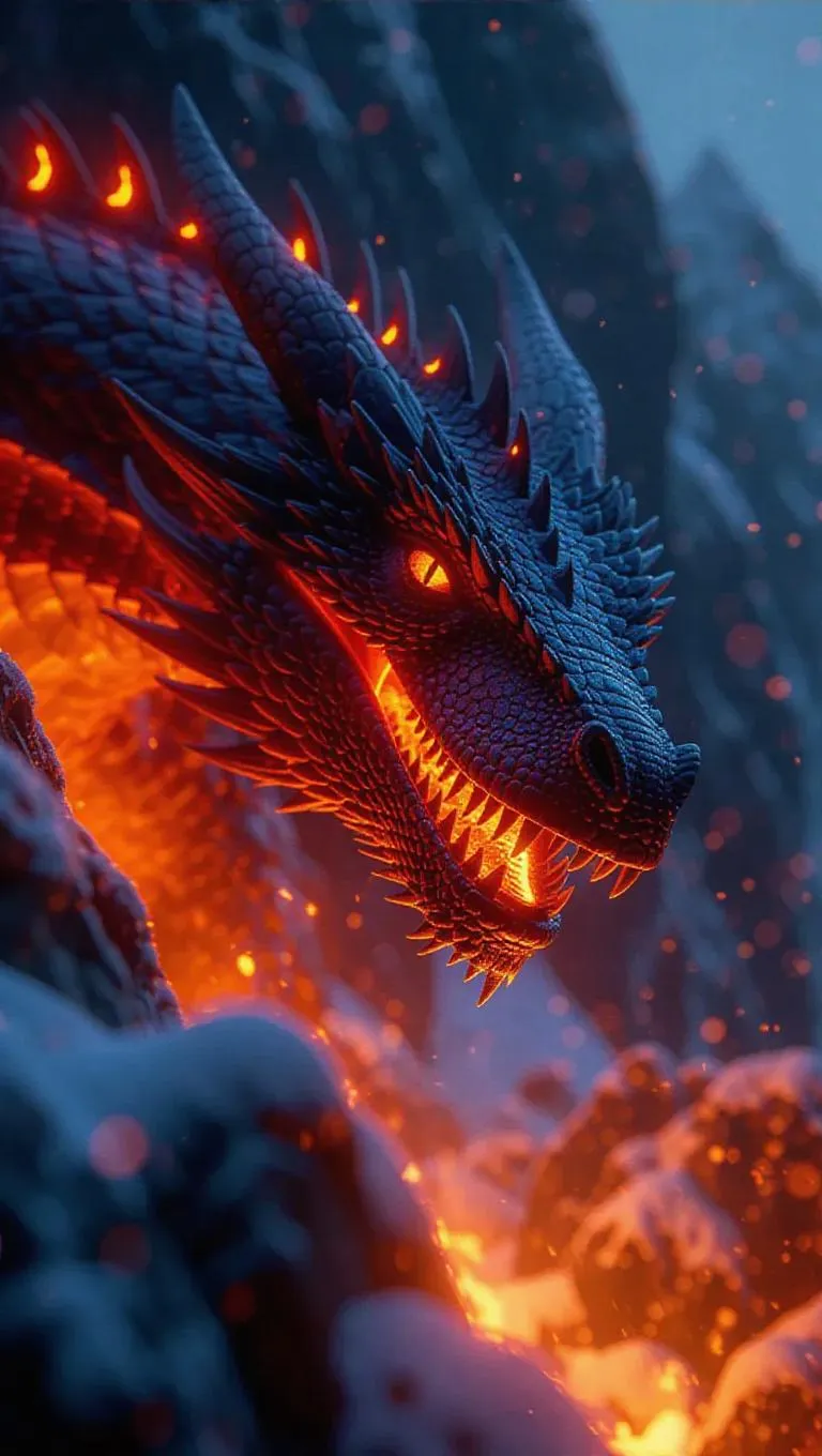 A cinematic slow-motion shot of a dragon emerging from a snowy mountain peak, scales glowing with molten lava. Use volumetric fog and 3D particle effects to simulate snowflakes and frost swirling around. Film with a Phantom Flex 4K at 500fps to capture the texture of the icy rock and fiery breath
