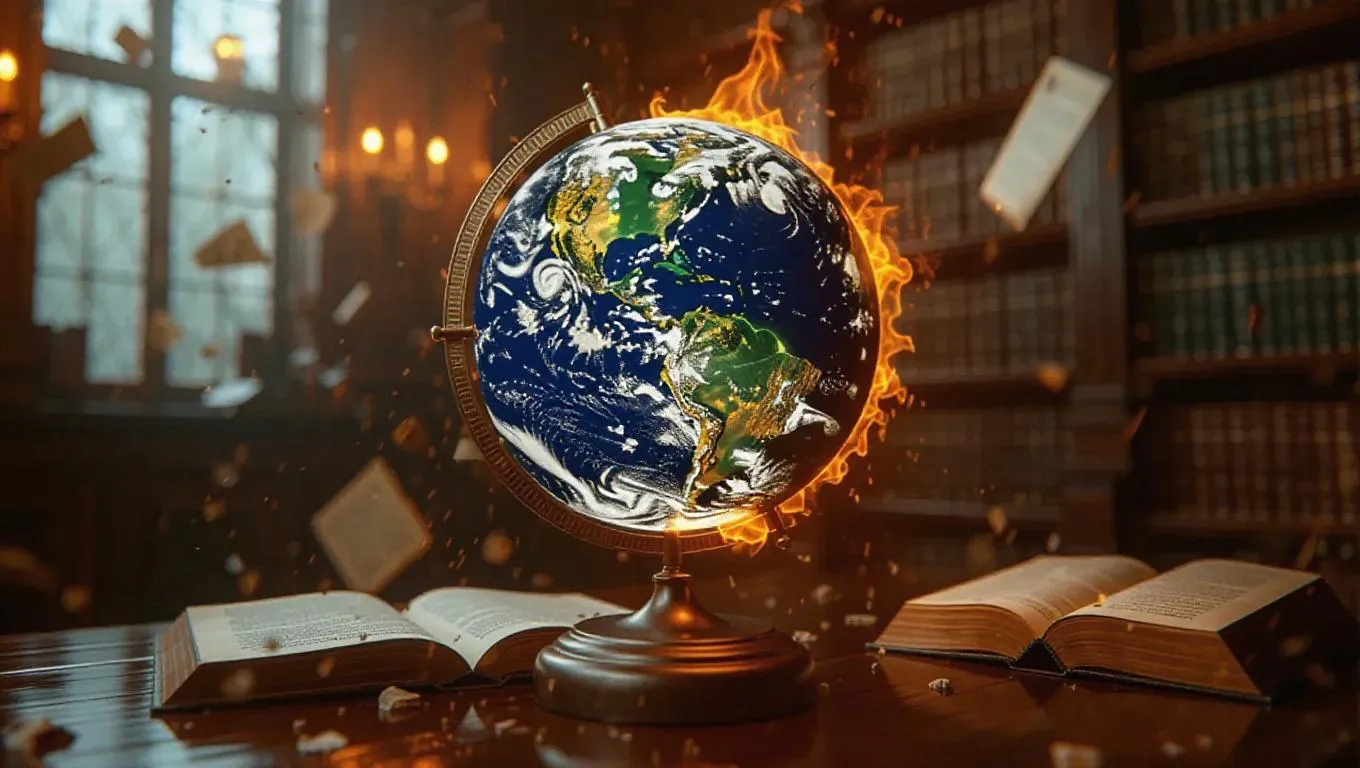 A library globe rotating swiftly with continents afire, oceans erupting into scalding steam that falls like ash-rain. Apocalyptic allegory, crystal lens distortion, set against a backdrop of a shadowy library and floating paper.