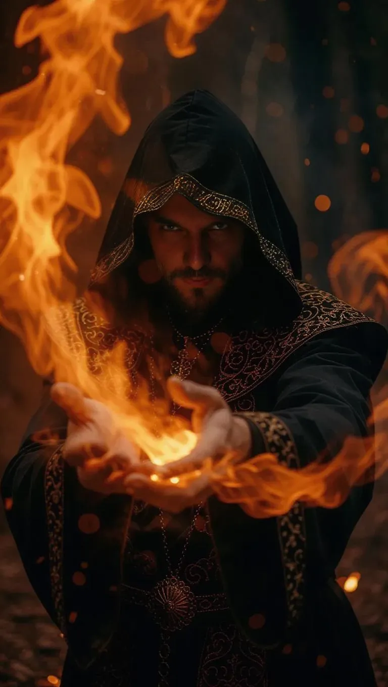 A male sorcerer summoning fire magic, swirling flames forming menacing symbols around him, harsh lighting, dark realism, ultra-HD.