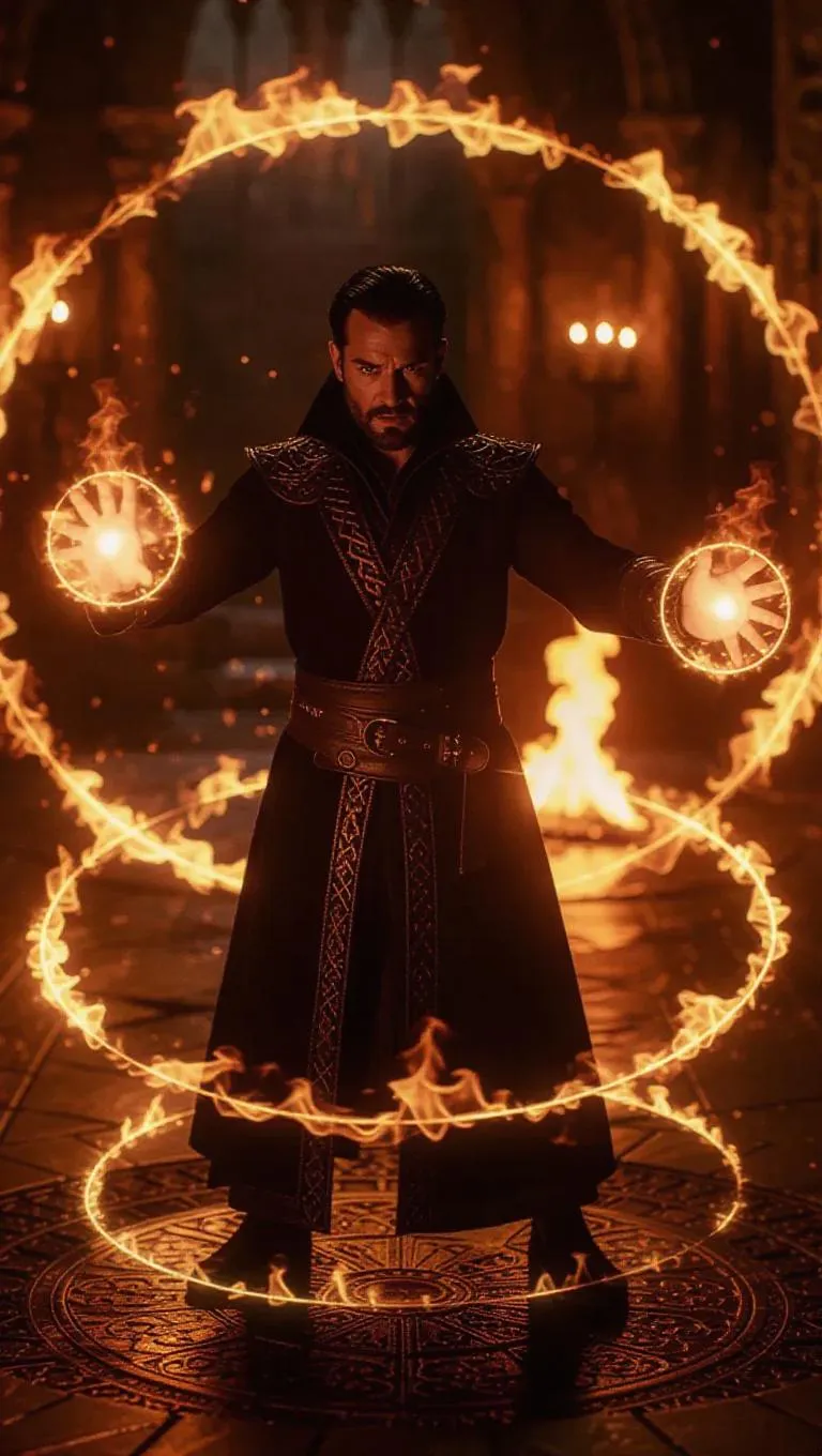 A fire mage stands at the center of a magical circle, surrounded by a ring of fire that keeps enemies at bay, the mage's hands glowing with magical flames, as he prepares to unleash a devastating fireball.