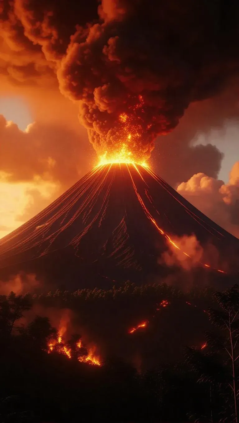 An enormous volcano erupting spectacularly, unleashing fountains of liquid fire into the sky, entire forests ablaze with unstoppable flames, hyper-realistic, extreme detail.