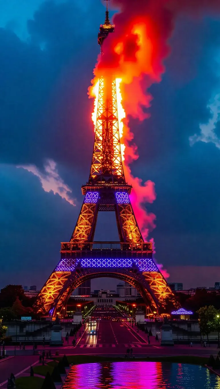 Eiffel Tower transformed into kilometer-tall gas burner, Eclectic ironwork glowing like colorful mosaics. Parisian street art flooded with liquid fire reflecting urban vibrancy.