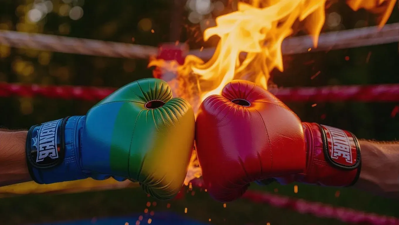 A pair of colorful boxing gloves suddenly catches fire during a vibrant training session at a summer camp, the flames spreading across the leather, the scene illuminated by the glow of the burning gloves.