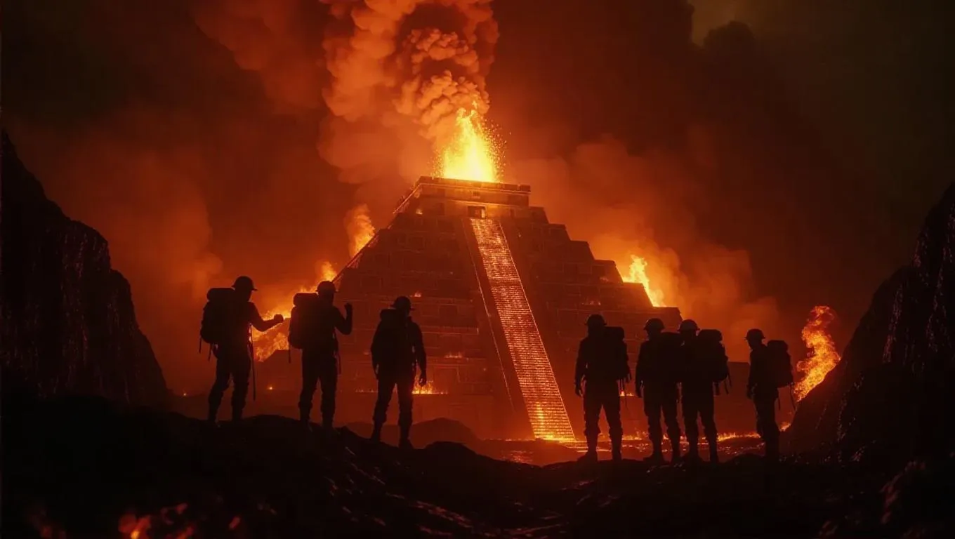 AI archaeologists discovering Atlantis using volcanic ash holograms, every eruption showcasing the city’s fate in glowing embers. Lidar-derived aesthetics interwoven with Renaissance mural flames.