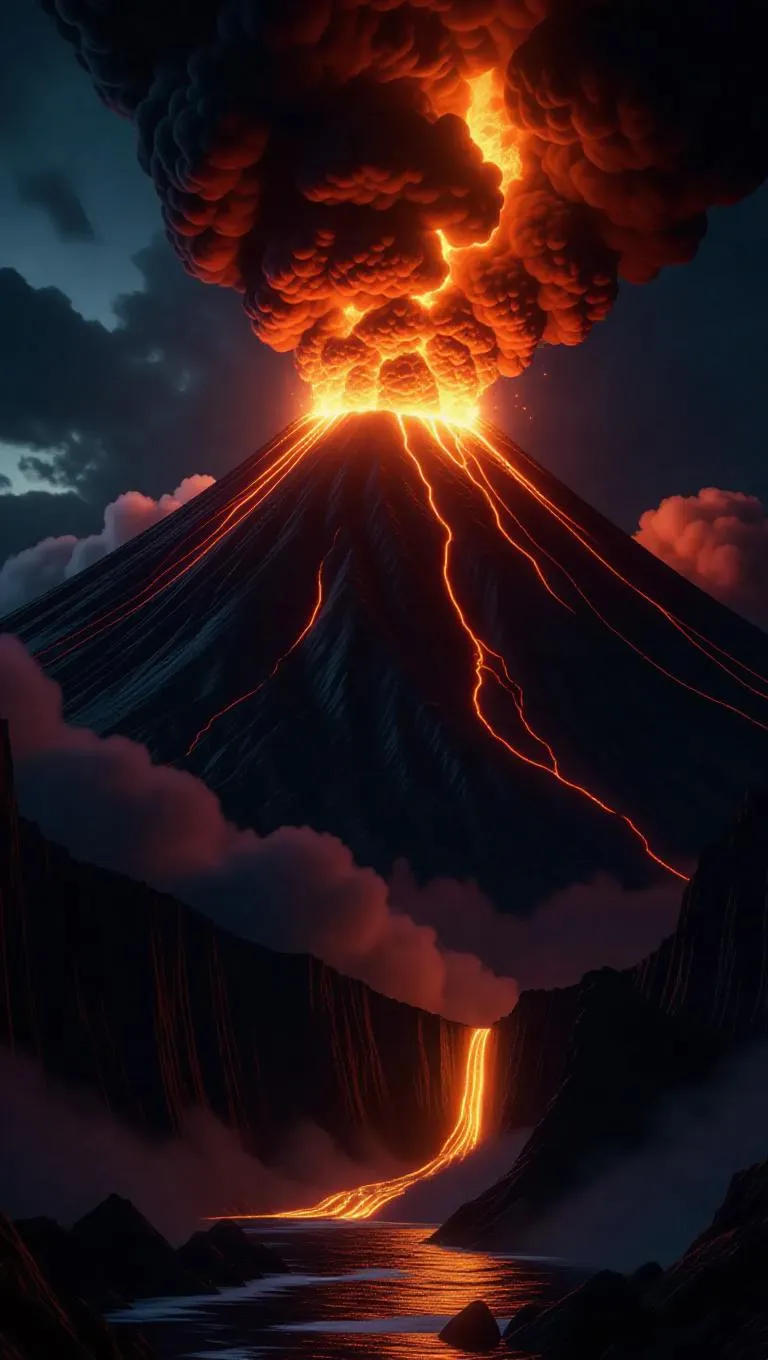 A colossal volcano erupting violently, spewing rivers of liquid fire into the air at night, entire cliffs bathed in unstoppable flames, hyper-realistic, extreme detail.