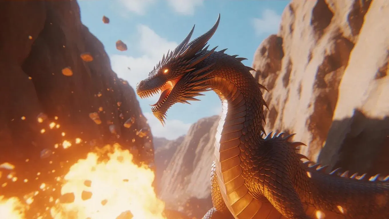 A cinematic slow-motion shot of a dragon emerging from a rocky canyon, scales glowing with molten lava. Use volumetric fog and 3D particle effects to simulate rock fragments and dust swirling around. Film with a Phantom Flex 4K at 500fps to capture the texture of the canyon walls and fiery breath