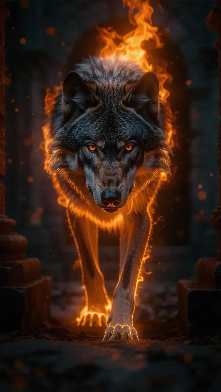 A majestic wolf composed entirely of flames, wandering through an ancient stone ruin, glowing eyes, sparks trailing its movements, hyper-realistic, cinematic lighting.