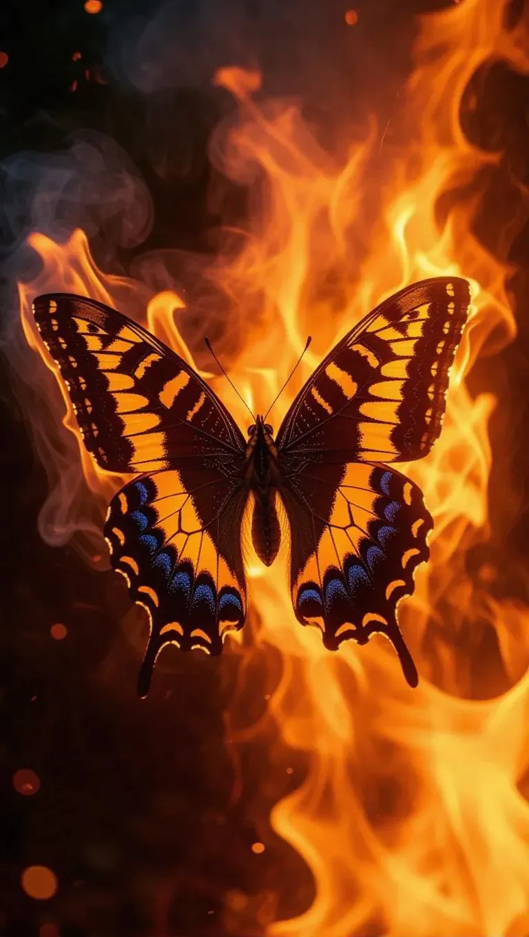 A close-up of a vibrant butterfly engulfed in fierce flames, its wings blazing with fiery intensity, casting a mesmerizing glow, with smoke curling around the edges, creating a dramatic and surreal atmosphere.