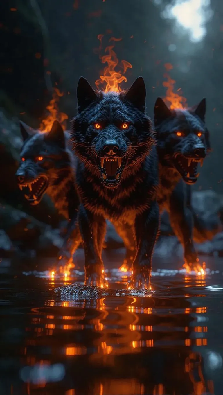 A dreadful three-headed Cerberus with fur made of raging flames, each head spewing fire as it stands sentinel by the river Styx in the underworld, intense lighting, hyper-realistic textures