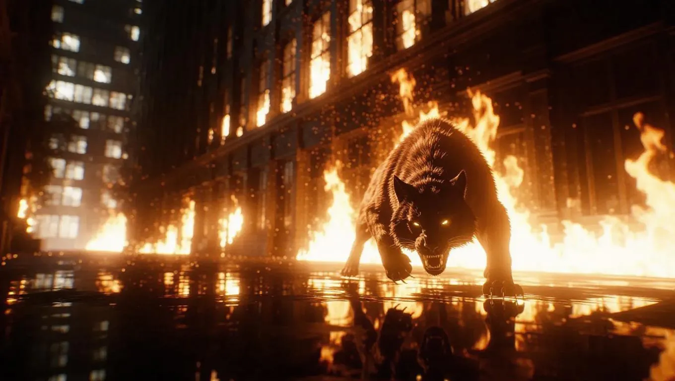 A fire beast prowls through a deserted urban landscape, its body covered in flames, the fire reflecting in its glowing eyes, as it moves with predatory grace, leaving a trail of destruction in its wake
