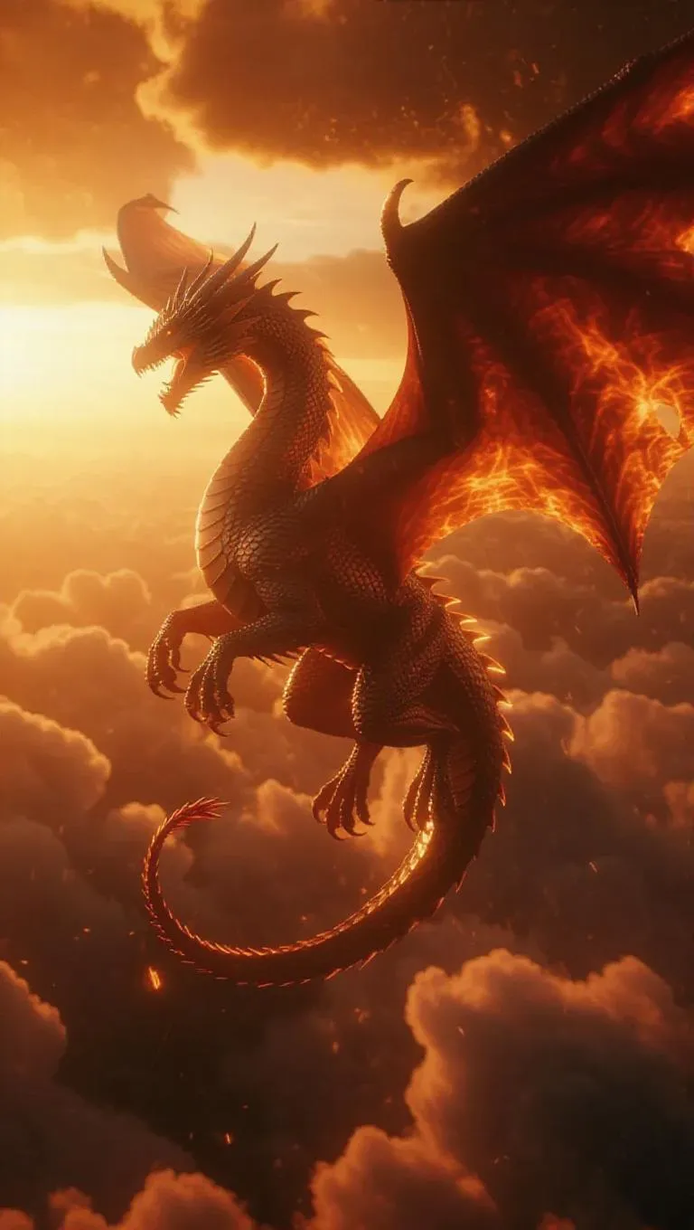 A gargantuan dragon wreathed in flames, its wings igniting the clouds, a symphony of heat in the air, ultra-detailed, cinematic epic fantasy