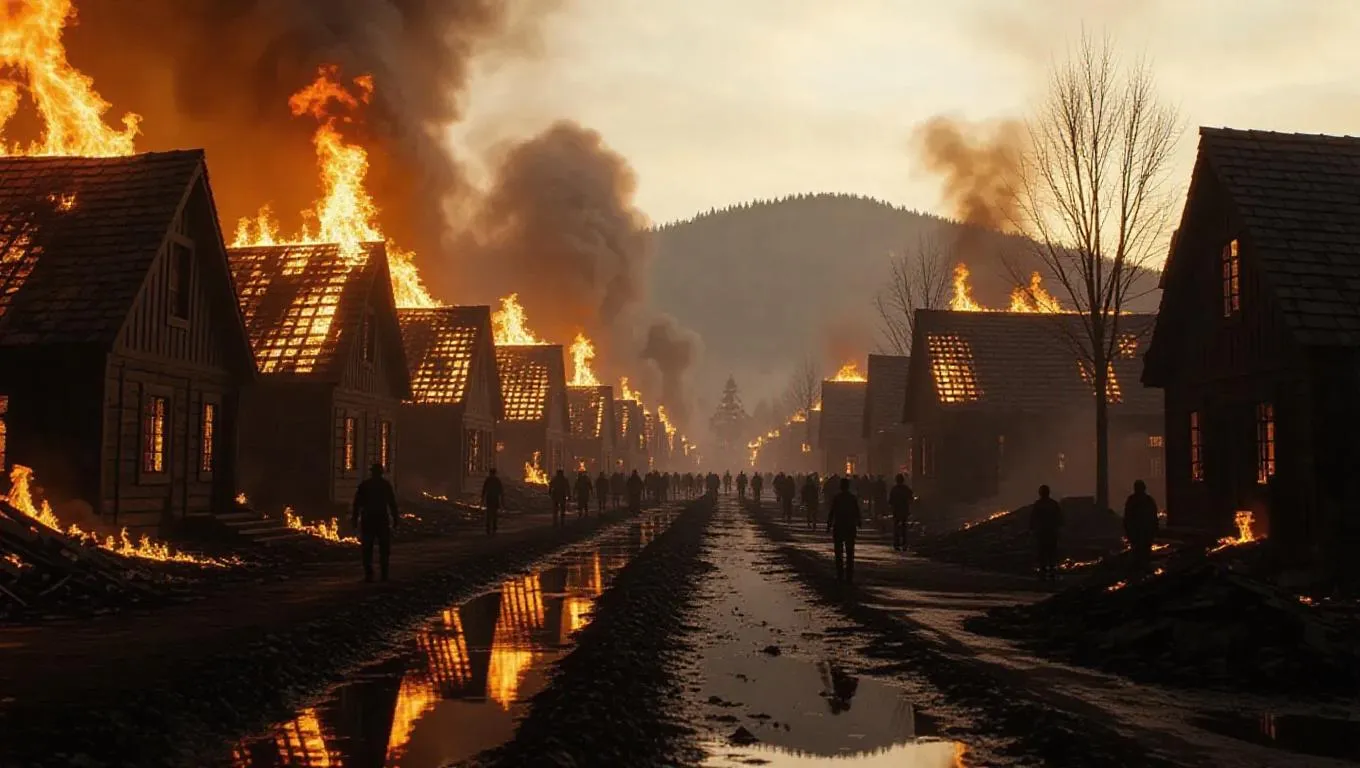 A picturesque village ablaze, with flames consuming everything in their path. Houses are reduced to charred skeletons, and the streets are covered in embers and ash. Villagers flee in terror, their cries echoing through the smoky air. The camera follows the fire's relentless advance, capturing the raw power and devastation of the blaze. The sound of roaring flames and collapsing roofs creates a haunting and immersive experience.