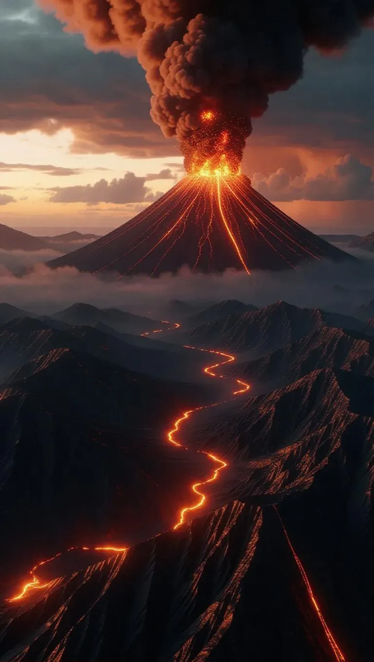 A monstrous volcano erupting dramatically, ejecting liquid fire into the sky, entire plains covered in unstoppable flames, hyper-realistic, extreme detail.