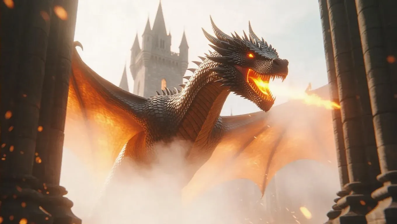 A cinematic slow-motion shot of a dragon emerging from a haunted castle, scales glowing with molten lava. Use volumetric fog and 3D particle effects to simulate ghostly figures and shadows swirling around. Film with a Phantom Flex 4K at 500fps to capture the texture of the ancient stone and fiery breath