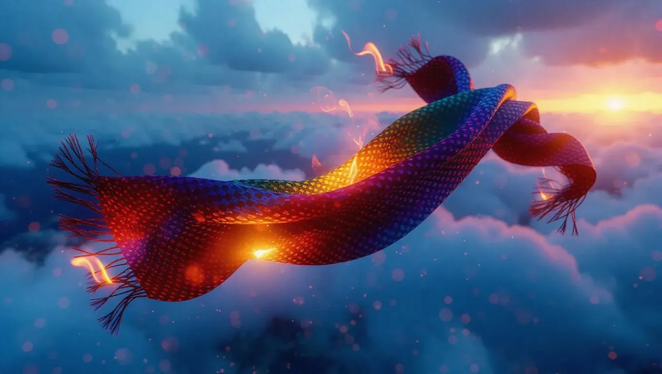 A colorful scarf burning from the edges, glowing softly against the cloudy afternoon, embers floating gently in the chilly breeze, poetic and serene, hyper-realistic.