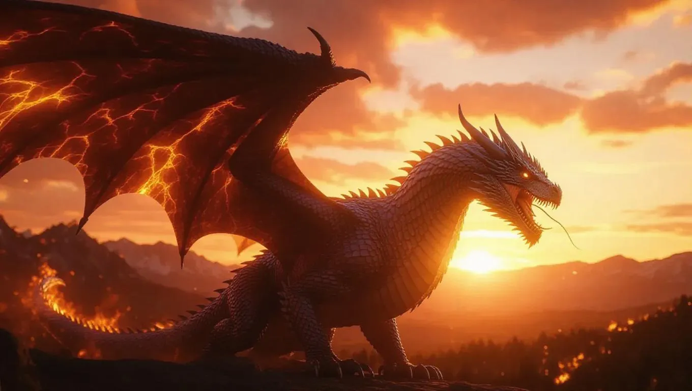 A giant dragon forged from flames, its wings creating whirlwinds of embers as it roars, the sunset sky ablaze with light, ultra-detailed, cinematic epic fantasy