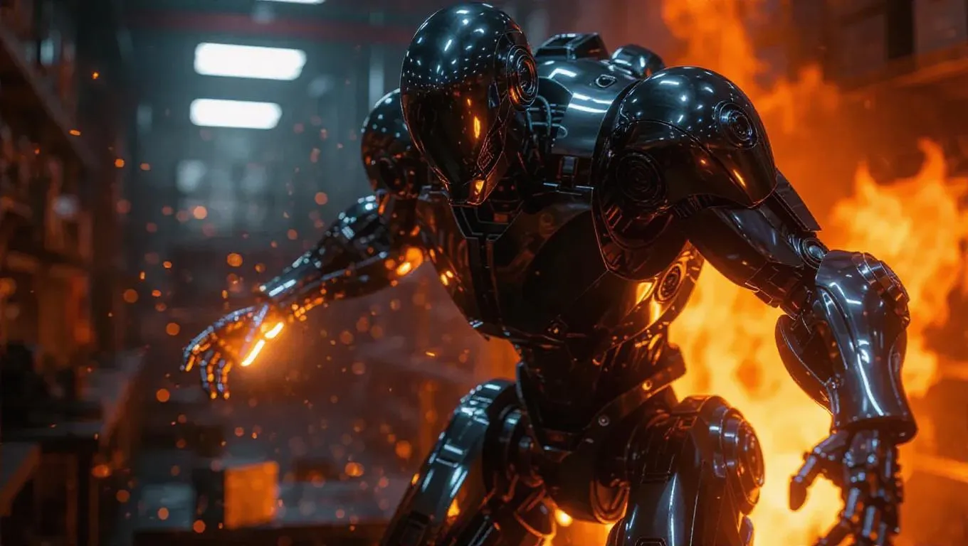 Robotic engineers with molten metal skin battling sentient flames in a laboratory, sparks flying over burning equipment. Dynamic mecha combat scene, chrome reflections distorted by heatwaves, with a robot engulfed in flames.