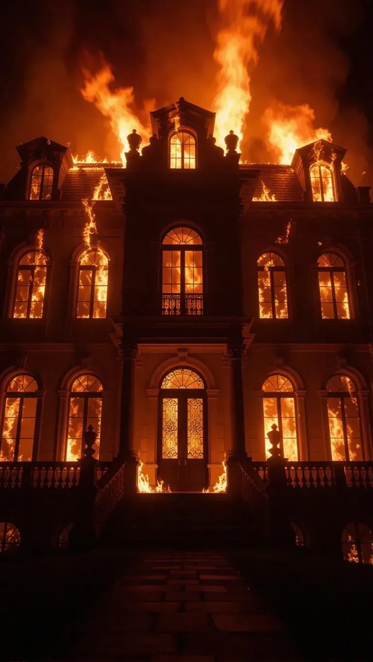 a mansion engulfed in flames, firelight reflecting on its luxurious facade as it slowly breaks apart, the structure collapsing in on itself with intense heat and smoke.