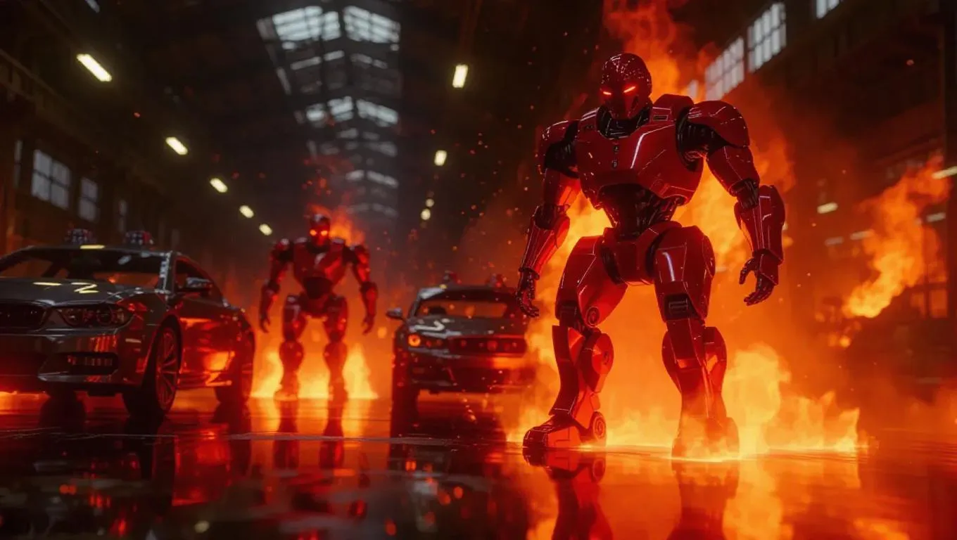 Robotic firefighters with smooth crimson skin battling sentient flames in an automotive factory, sparks flying over burning vehicles. Dynamic mecha combat scene, chrome reflections distorted by heatwaves, with a robot engulfed in flames.