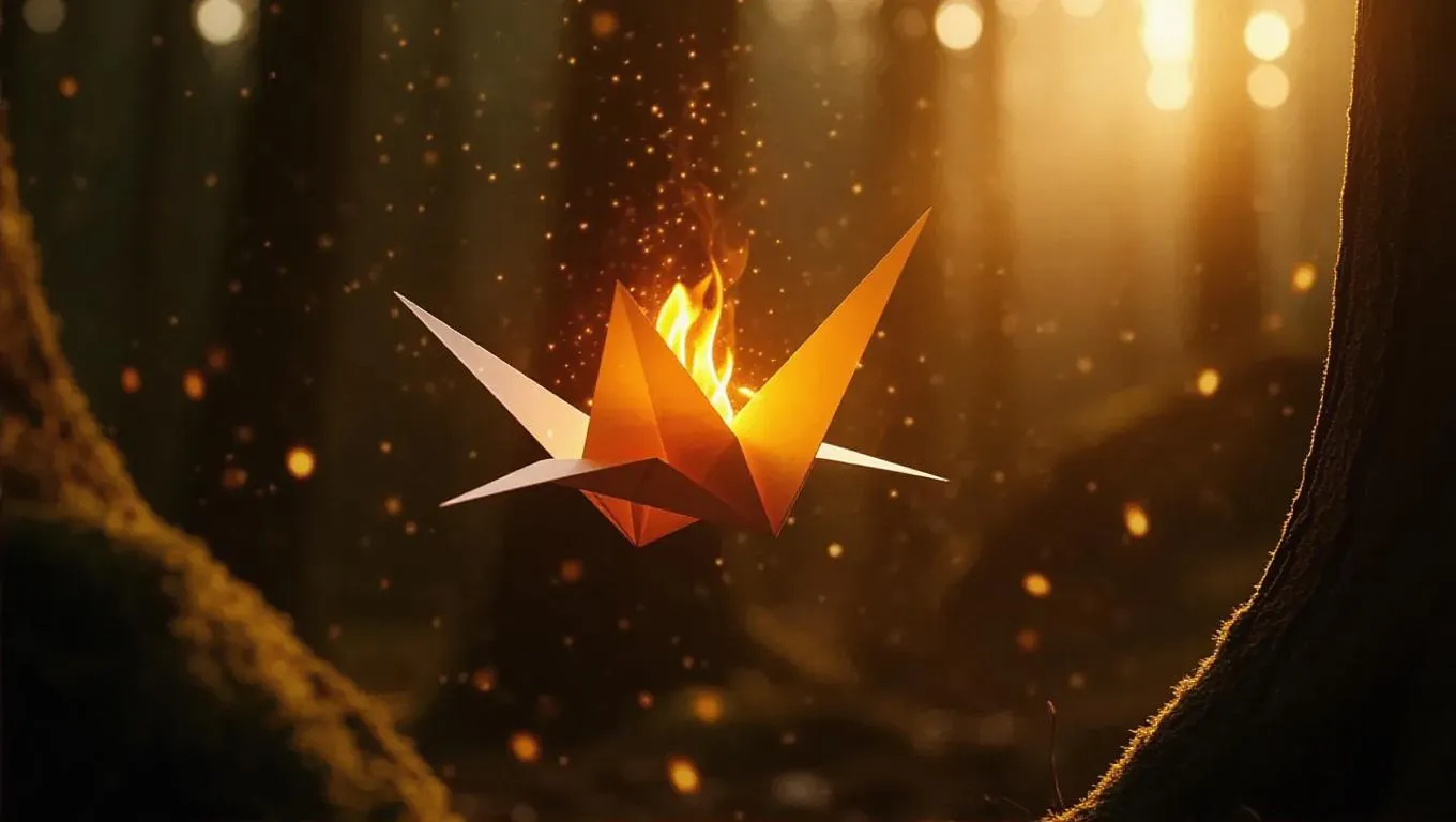 A delicate paper crane floating through a forest, its edges slowly catching fire, glowing embers drifting away, soft golden light, magical atmosphere, ultra-detailed