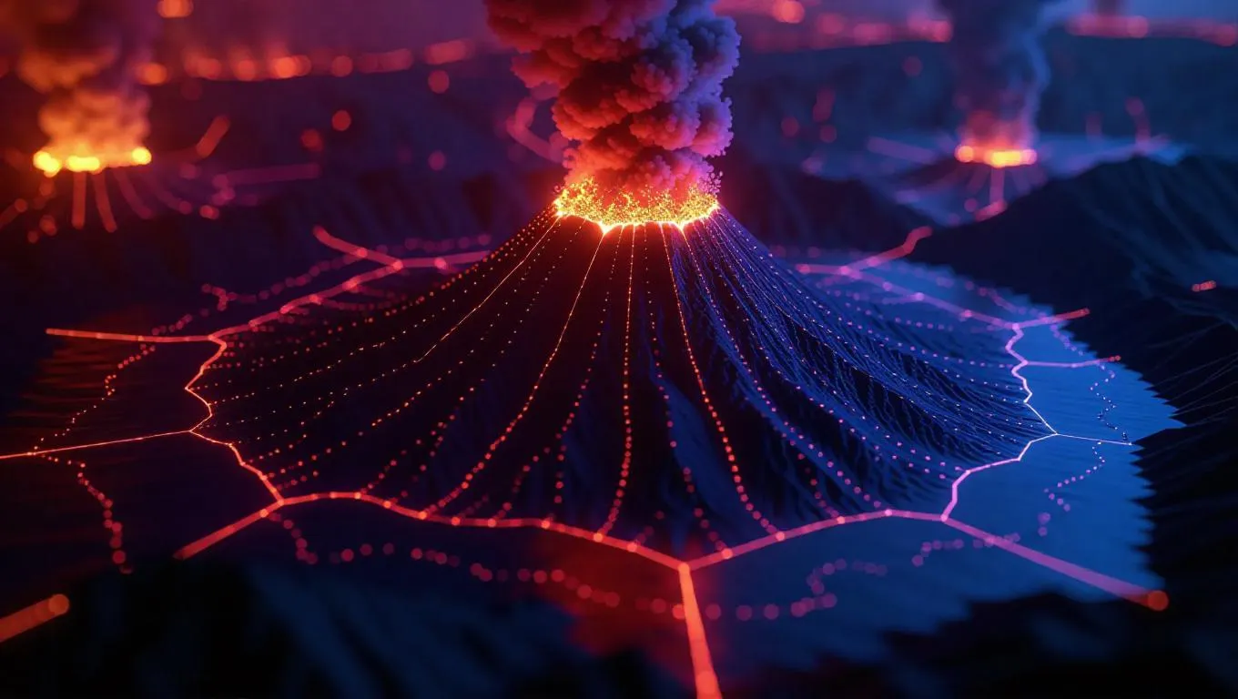 AI archaeologists interpreting Atlantis via volcanic ash diagrams, every eruption illustrating the city's collapse into vibrant fire. Lidar-surveyed remnants combined with bold geometric flames.