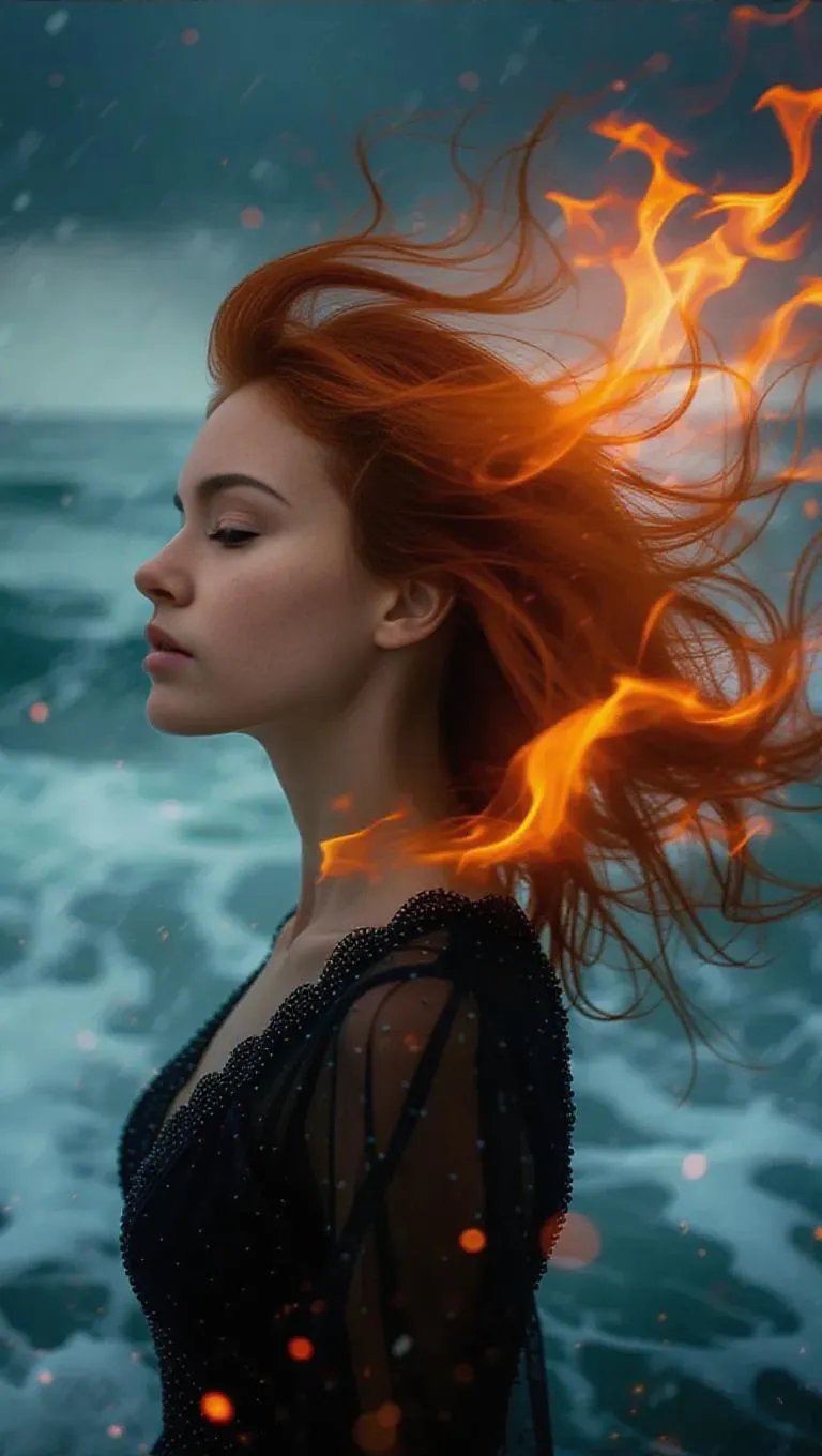 A surreal portrait of a woman with her hair transforming into vibrant flames, the fire flowing like silk in the wind, seamlessly blending with a stormy ocean backdrop, dreamy and ethereal, ultra-detailed, cinematic lighting, glowing embers.