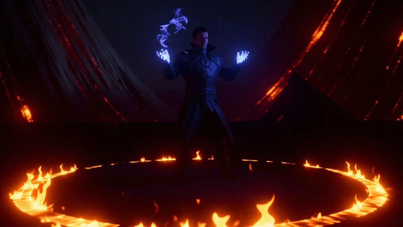 A fire mage stands at the edge of a volcano, surrounded by a ring of fire that keeps enemies at bay, the mage's hands glowing with magical flames, as he prepares to unleash a devastating fireball.