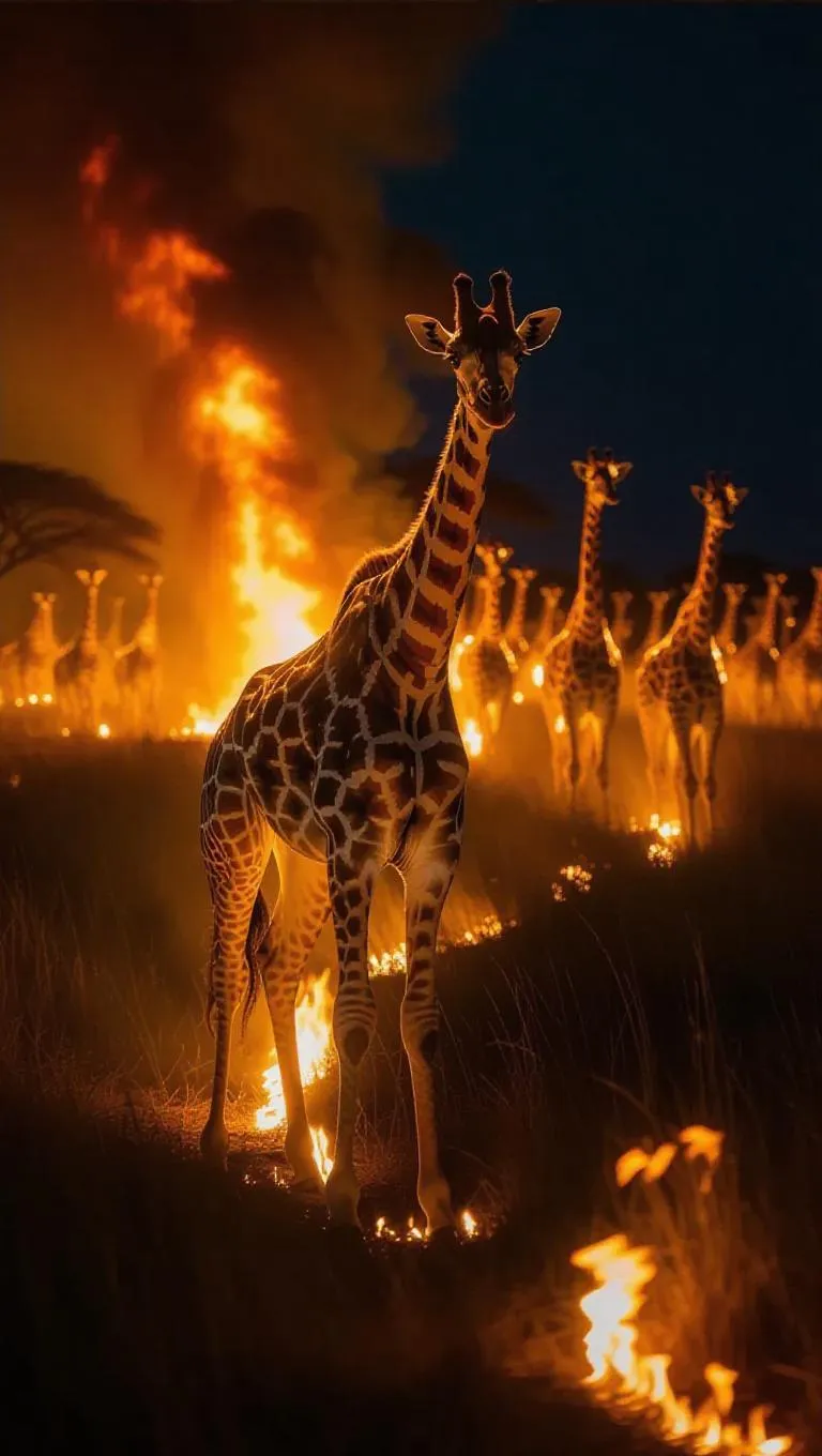 Migrating giraffe herd aflame across savanna, golden fire ripples mimicking grass waves. Burning hooves leave phosphorescent fungal spores, night vision documentary aesthetic.