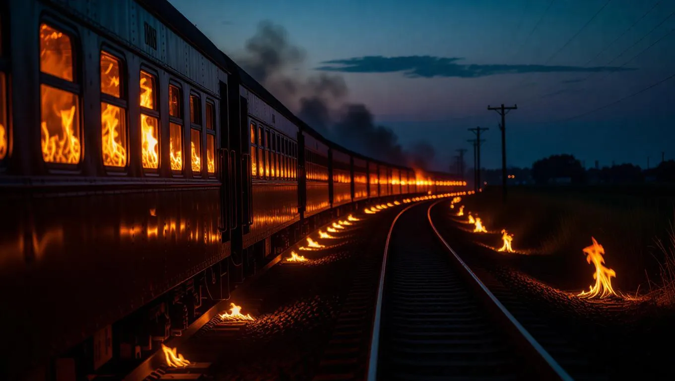 A train derailment has turned a once-bustling railway into a fiery nightmare. The train cars, loaded with passengers, are now engulfed in flames. The metal screeches and groans as the fire belches smoke. The tracks themselves are glowing red-hot, as if they are about to curve. The surrounding farm is also on fire, with flames spreading rapidly. The twilight sky is illuminated by the intense light of the fire, casting a serene glow over the scene.