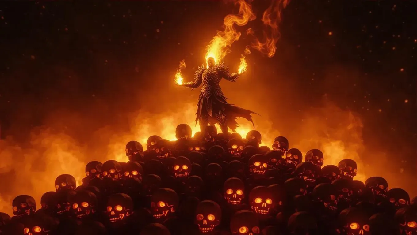 A legendary fire elementalist, his entire being made of flickering fire, standing proudly atop a hill of blazing skulls, flames crashing into the sky, ultra-detailed, dark fantasy