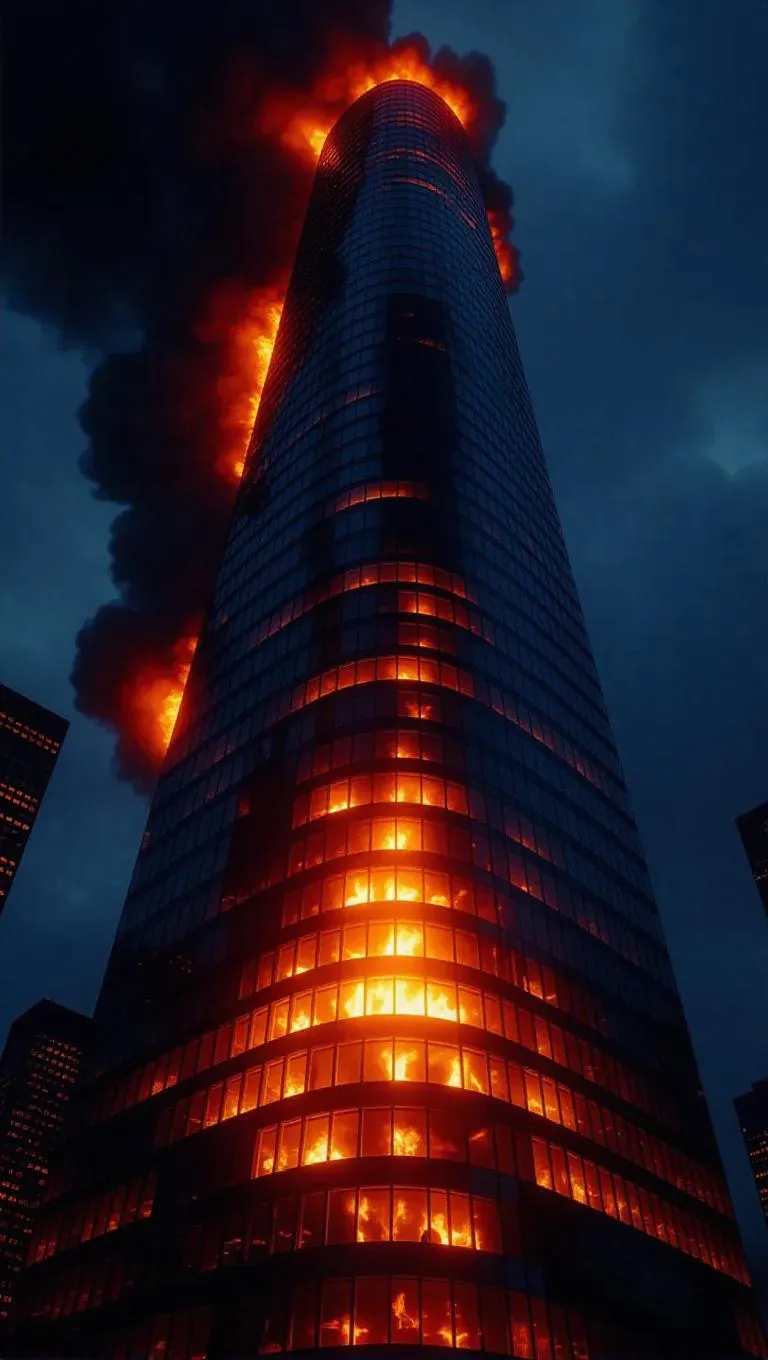 a skyscraper engulfed in flames, firelight reflecting on its glass surface as it slowly melts, the structure collapsing in on itself with intense heat and smoke.