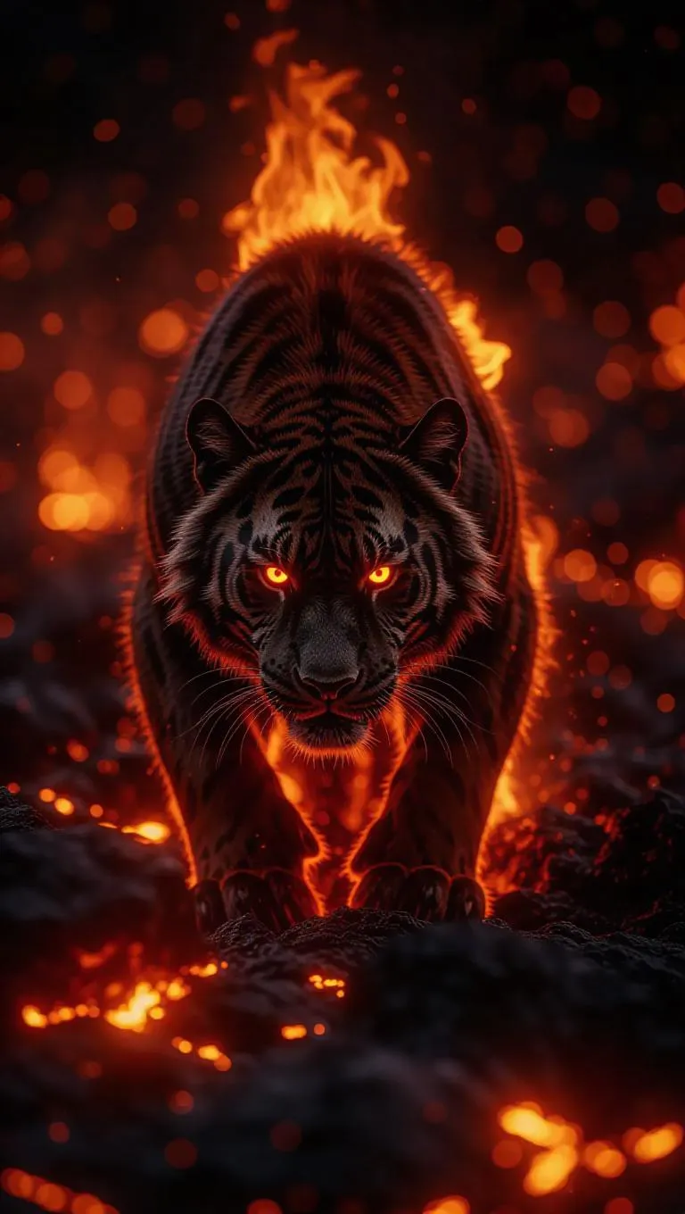 A fire beast lingers in a fiery lava field, its body covered in flames, the fire reflecting in its glowing eyes, as it moves with predatory grace, leaving a trail of destruction in its wake
